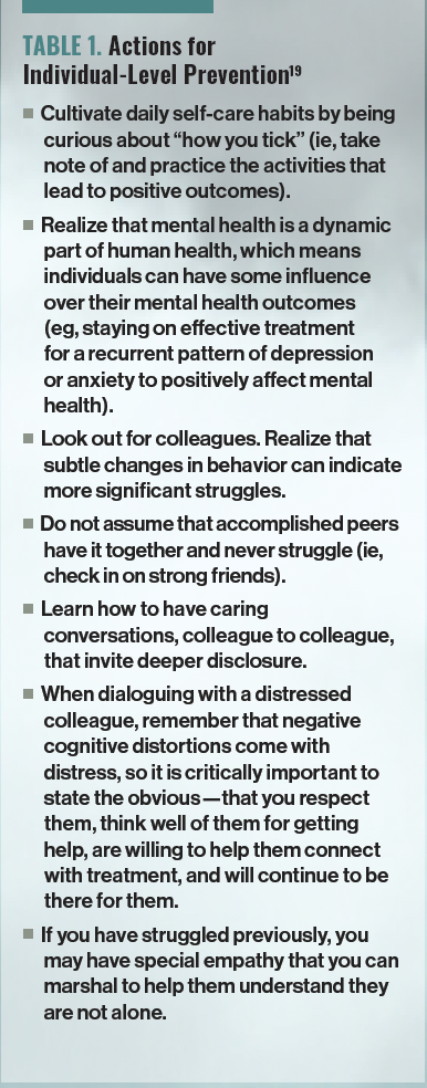 1 donne plusieurs exemples d'actions individuelles pour la prévention du suicide des cliniciens.19 Le tableau 2 donne des exemples d'actions au niveau des médecins leaders et des éducateurs. En outre, les cliniciens sont sensibles et aidés par les mêmes traitements fondés sur des preuves que les patients de la communauté en général.13 Le tableau 3 énumère certaines des stratégies de prévention du suicide les mieux étudiées et applicables à tous.13