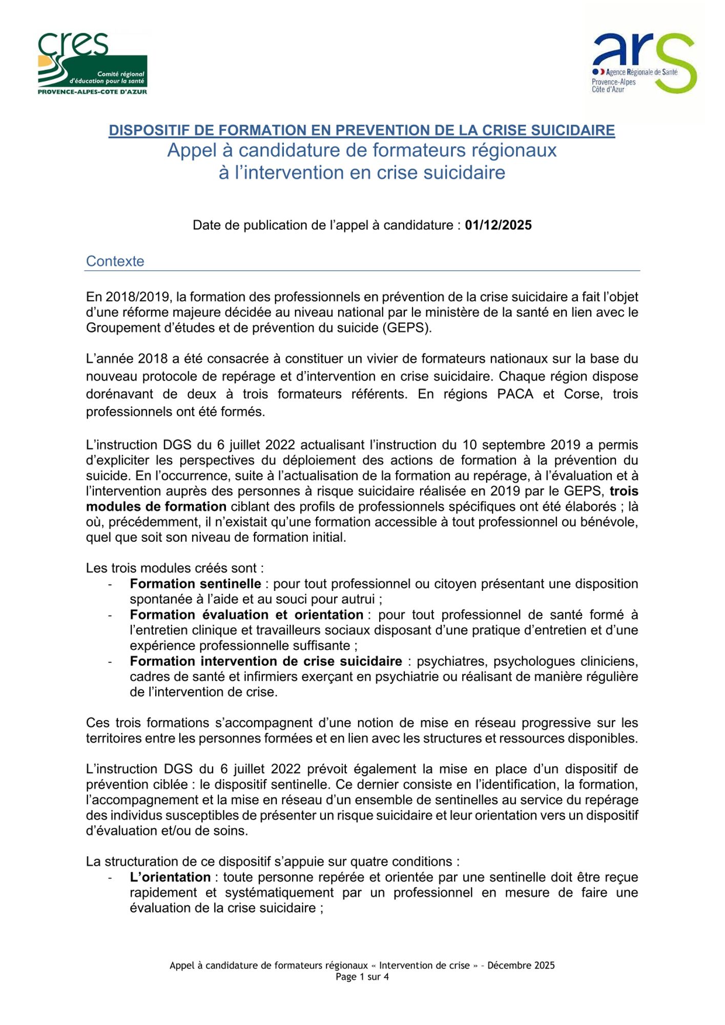 Dans le cadre du dispositif de formation à la prévention de la crise suicidaire, le CRES va organiser une formation de formateurs régionaux à l'intervention de crise, en mars 2026.